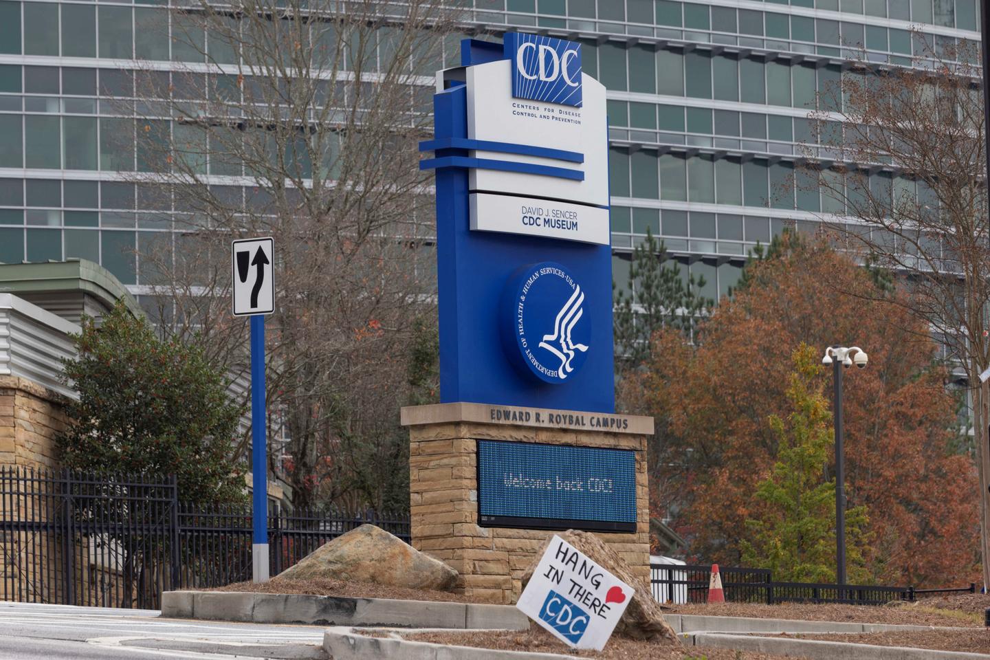 Un cartel de apoyo a los trabajadores de los Centros para el Control y la Prevención de Enfermedades (CDC) frente a su sede en Atlanta, Georgia, EE. UU. (20 de noviembre de 2025).